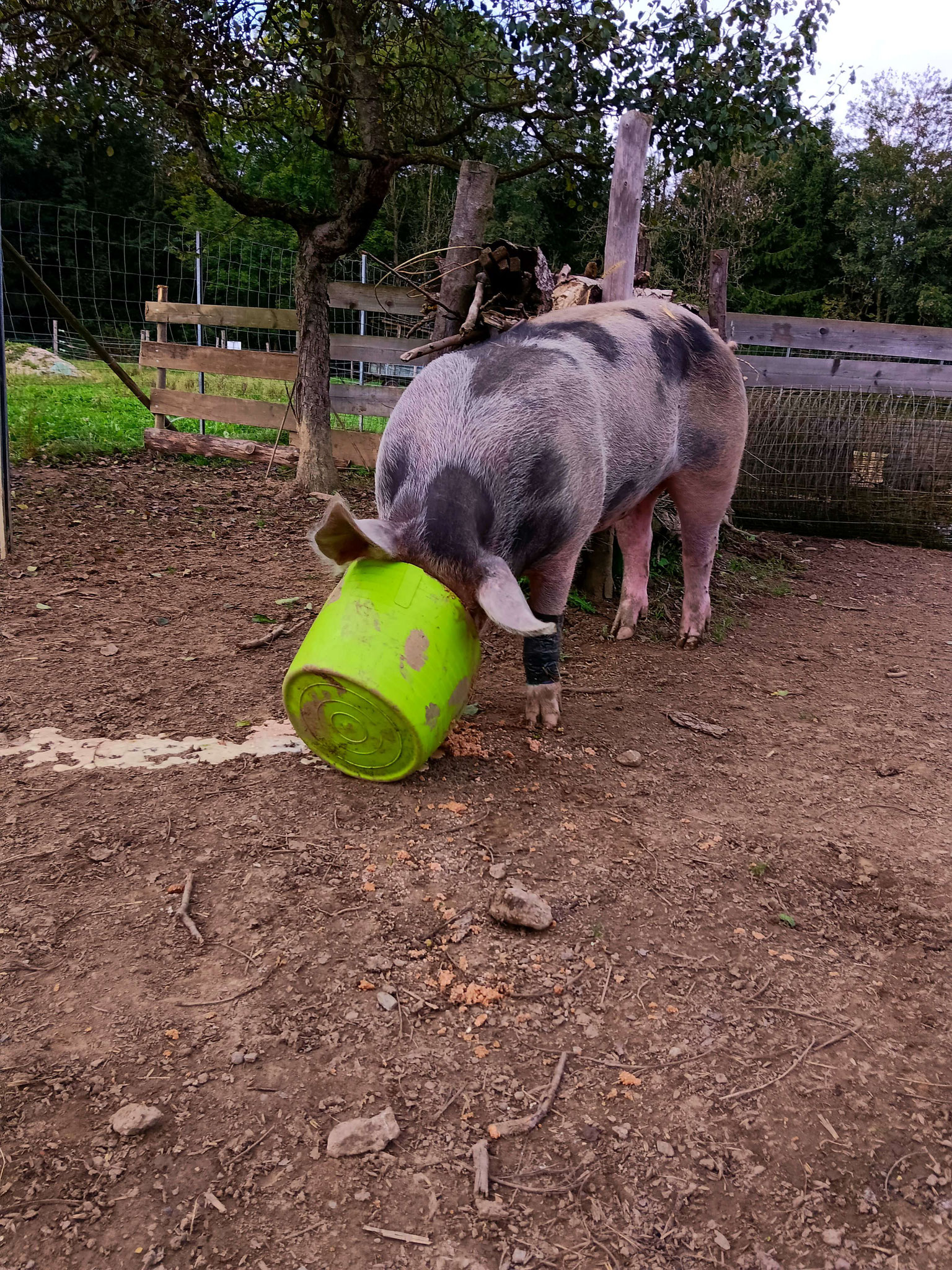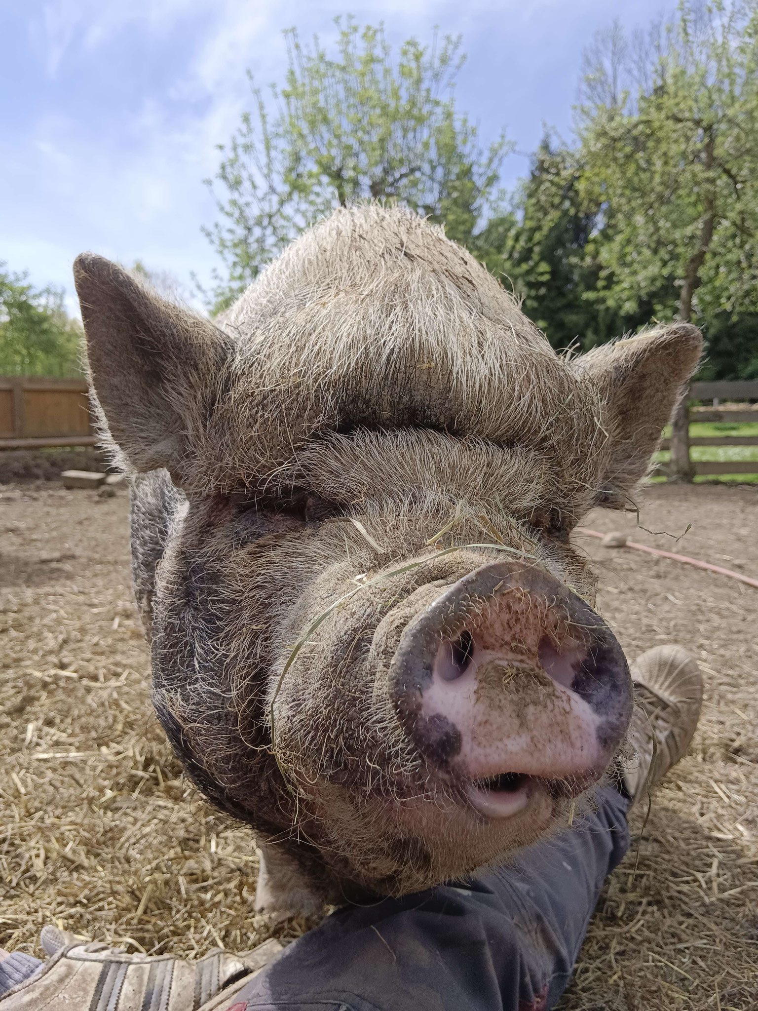 Schweinedame wurde ein fröhlicher, manchmal auch sehr gesprächiger Sonnenschein, der sich heute gerne genüsslich kraulen lässt und dabei zufrieden vor sich hin grunzt.